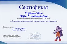 Учитель Муринова В.М. успешно закончила дистанционное обучение в количестве 24 часов по теме "Основы анимационной деятельности с детьми"