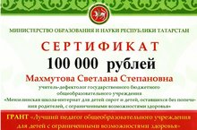 Учитель-дефектолог Махмутова С.С. выиграла грант «Лучший педагог общеобразовательного учреждения для детей с ограниченными возможностями здоровья» и получила сертификат Министерства образования и науки РТ на 100 тысяч рублей.