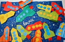 Работая в рамках модуля Патриотическое воспитание, с детьми средней-подготовительной группы прошло занятие, на котром дети выполняли коллективую аппликацию, на тему " Космический корабль" -