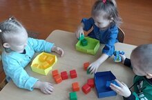 Работая по модулю сенсорика в младший группе провели игру "Разложи кубики в коробку". Где дети собирали кубики в свои коробочки.