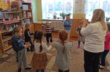 В средне- подготовительной группе готовятся к новогоднему утреннику, дети вместе с воспитателем изучают хоровод -