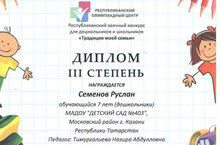 Поздравляем наших воспитанников, Семеновых Руслана и Ясмину, с победой в республиканском конкурсе "Традиции семьи", организованного республиканским олимпиадным центром. Руководитель:Тимургалиева Назира Абдулловна.