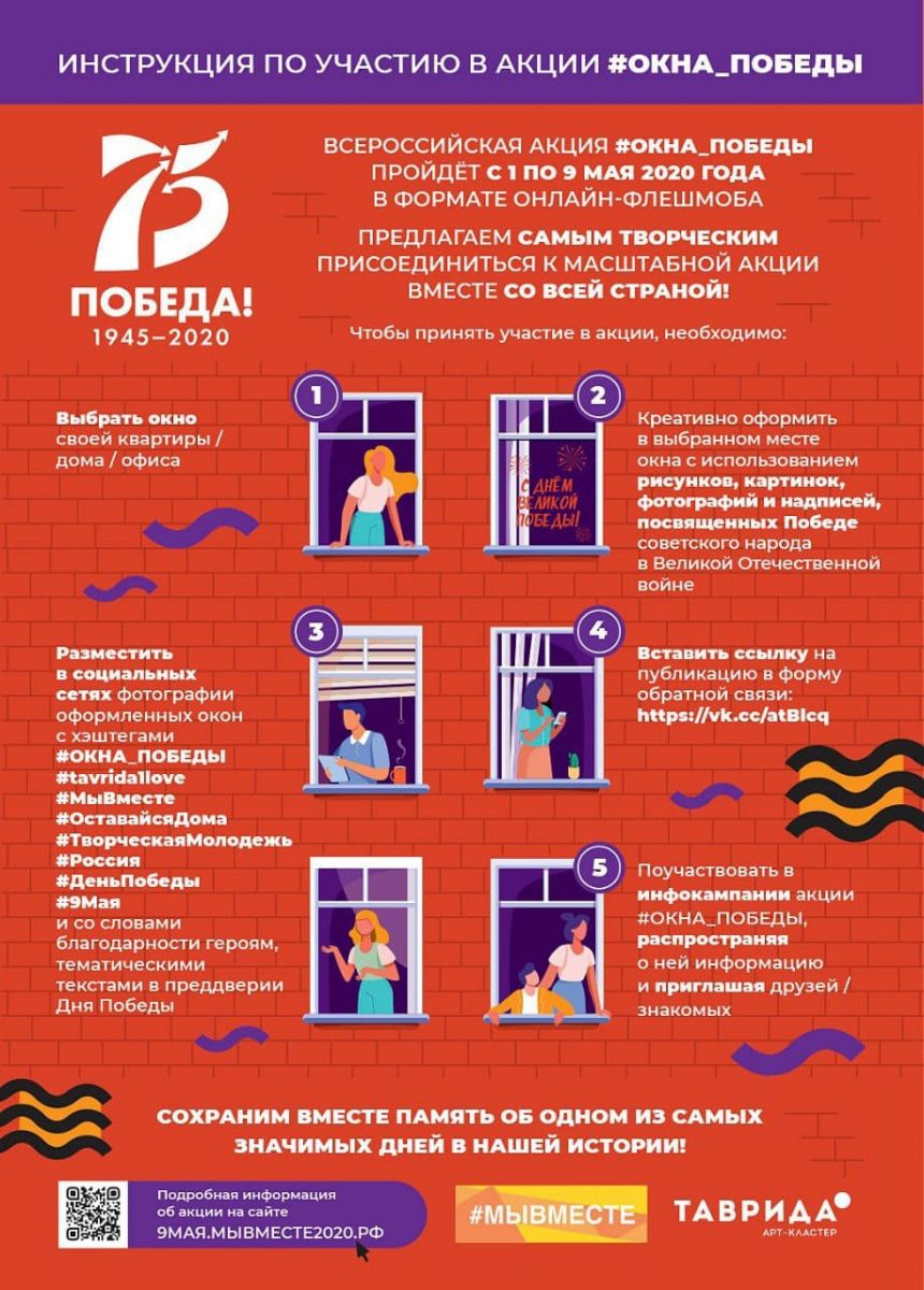 Сохраним вместе память об одном из самых значимых дней в нашей истории. Предлагаем самым творческим присоединиться к маштабной акции # Окна Победы и всероссийскому исполнению песни "День Победы"