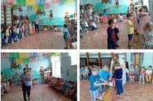 24 июля дети путешествовали в космическом пространстве вместе с ведущей развлечения воспитателем Зиганшиной Г.Г., Лунатиком и Звездочетом (роли которых исполнили воспитатели Сафиуллина А. А., Гамирова Э.Х.). Космическое путешествие получилось интересным и занимательным. Ребята обобщили свои знания о космосе, полученные в течение года и летней тематической недели. Дети занимались подготовкой в космонавты в игре: "Наш дружный экипаж", исполнили танец "Я-ракета", спасли Луну и Лунатика, отгадав сложные загадки пришельцев. Звездочету помогли навести порядок на орбите, играя в музыкальную игру: "Парад планет". Соревновались в умении испытывать невесомость (стоя на одной ноге) в открытом космосе и исследовали неизвестную планету (прыгая с островка на островок). Всем было весело!