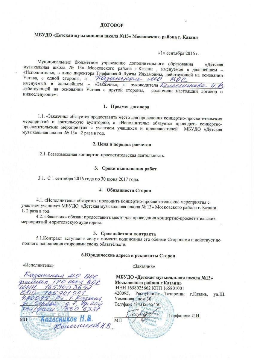 Договор между ДМШ № 13 и Казанской МО ВОС, 2016