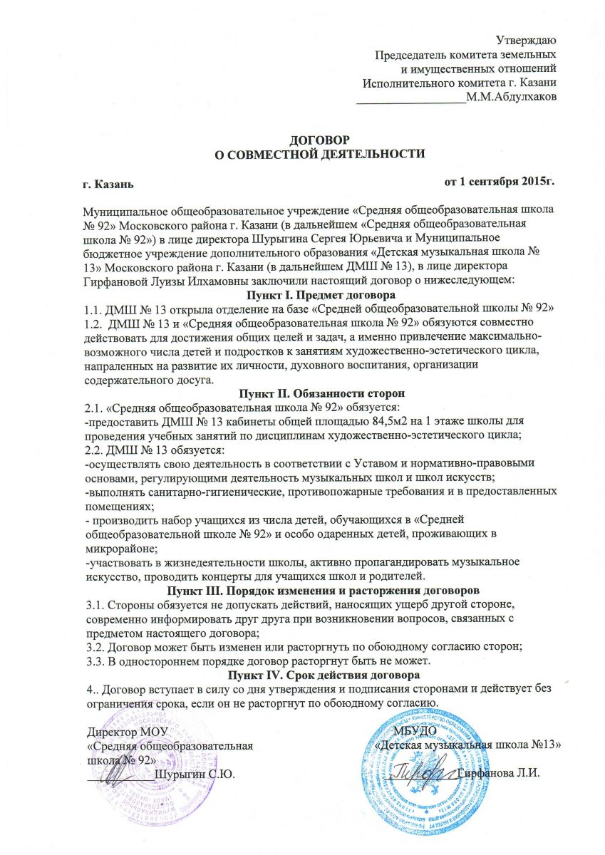 Договор о совместной деятельности ДМШ № 13 с МОУ СОШ № 92