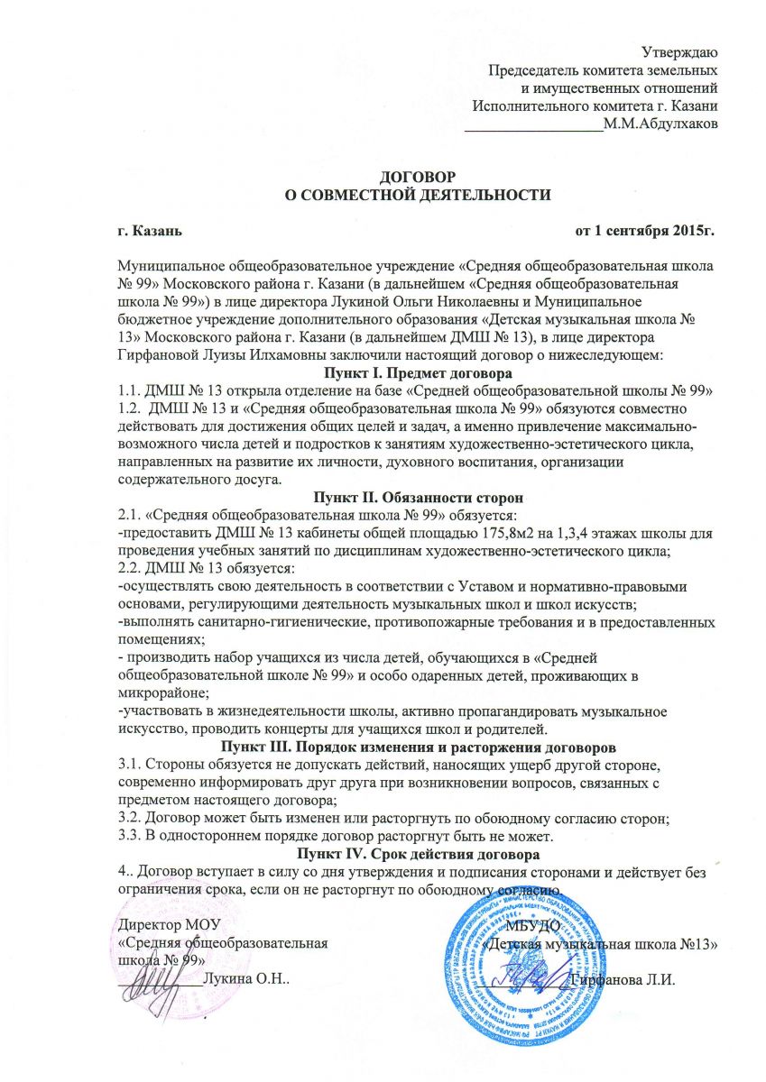 Договор о совместной деятельности ДМШ № 13 с МОУ СОШ № 99