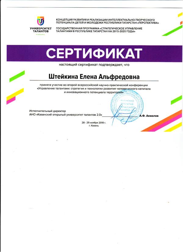 11.2018 Вторая Всероссийская научно-практическая конференция "Управление талантами: стратегия и технологии человеческого капитала и иновационного потенциала территорий" Сертификат