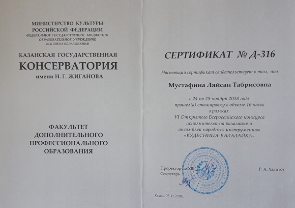 Стажировка в рамках Всероссийского конкурса исполнителей на балалайке и ансамблей народных инструментов "Кудесница-Балалайка" Сертификат