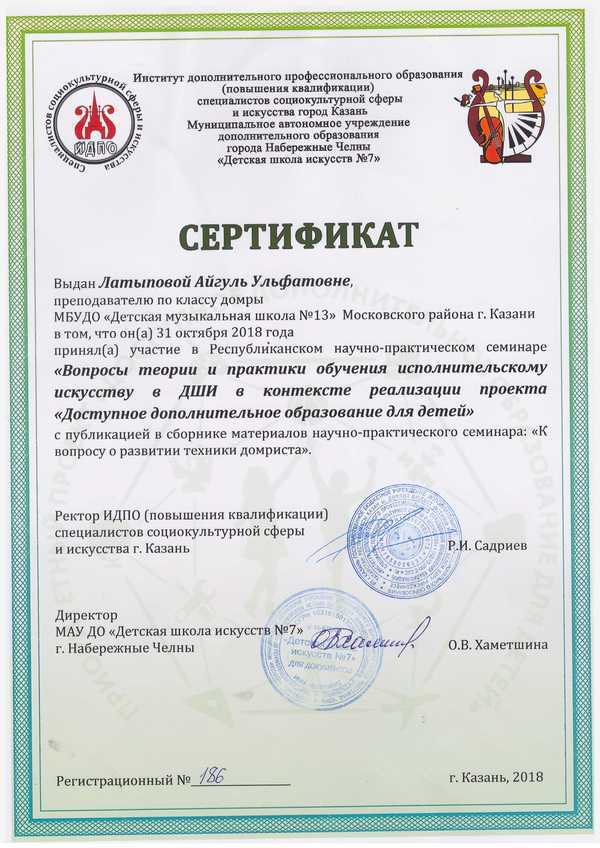 Республиканский научно-практический семинар "Актуальные проблемы теории методики в области искусства РТ" Сертификат Сертификат