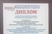 Дипломом лауреата Всероссийского конкурса "Новаторство в образовании - 2016" награжден "Центр искусств "Шарм" в номинации "Самый успешный проект - 2016" в области реализации программ художественного воспитания "Центра искусств "Шарм" - как инновационная площадка развития дополнительного образования.