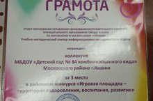 Поздравляем коллектив МБДОУ "Детский сад № 84 комбинированного вида" с победой в районном смотре- конкурсе "Игровая площадка - территория оздоровления, воспитания, развития". Грамота за 3 место, приказ № 578 от 28.06.2019г.