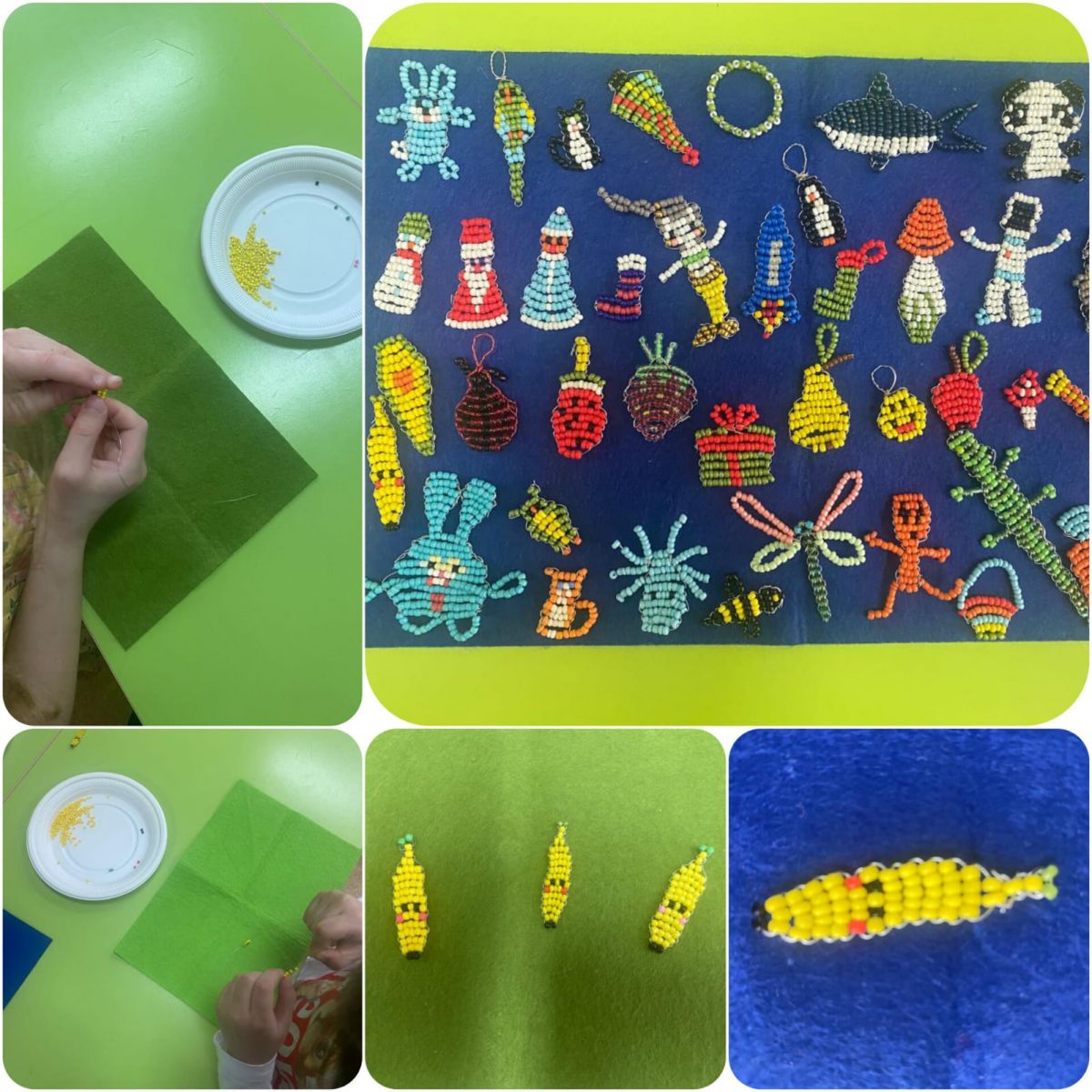 Дети старших и подготовительных групп посещают кружок бисероплетения "Бусинка". Кружок по бисероплетению «Бусинка" направлен на развитие мелкой моторики и своевременной помощи в формировании у детей дошкольного возраста последовательной координации движений пальцев рук. Данный кружок очень нравится детям, им удаётся создавать настоящие шедевры из бусинок.