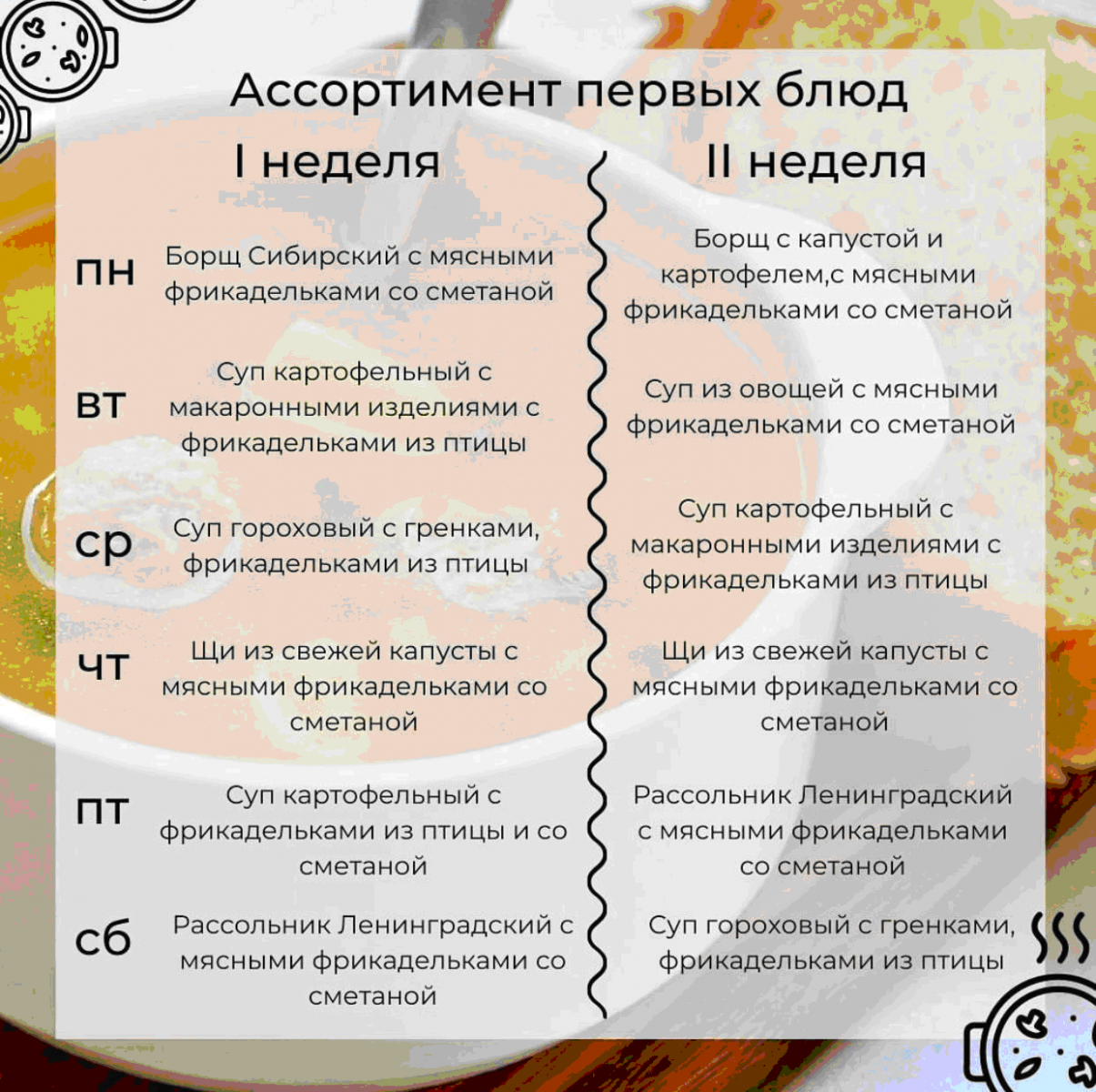 Меню супов для учащихся с 20 по 25 сентября 2021 года