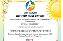 Поздравляем победителей международного творческого конкурса "Сударыня наша, Масленица!" Александрову Анастасию, Басову Дарью, Ерашову Екатерину, Николаеву Яну, Никулину Аделину, Сабирзянову Азалию, занявших 1 места. Молодцы!!!