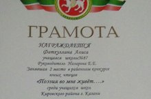Поздравляем ученицу 2а класса Фаткуллину Алису,занявшую 2 место в районном конкурсе чтецов "Поэзия во мне живет..." среди учащихся Кировского района г.Казани