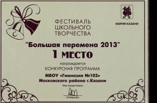 Наша гимназия участвовала в фестивале школьного творчества "Большая перемена - 2013" и заняла 1 место!!!!! Поздравляем нас!!! !!