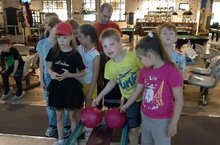 Сегодня дети пришкольного лагеря ' Радуга ' посетили ТЦ Тандем.Играли в боулинг.