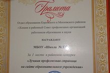 Отдел образования Кировского и Московского районов г.Казани и районный Совет профсоюзных организаций работников образования и науки наградили нашу школу грамотой за I место в районном конкурсе "Лучшая профсоюзная страница на сайте образовательного учреждения"! Мы-молодцы!