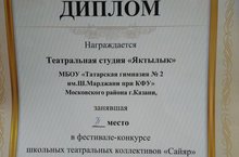 Гимназиянең "Яктылык" театр студиясе шәһәркүләм мәктәп театр коллективларының "Сәйяр" фестиваль-конкурсында катнашып, 2 нче урын яулады. Котлыйбыз!