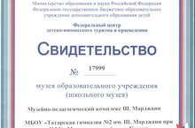 Гимназиянең Ш.Мәрҗани исемендәге музейлар комплексы Россия Федерциясенең балалар һәм яшүсмерләр туризмы үзәгенә беркетелүе турында таныклык алды. Котлыйбыз!
