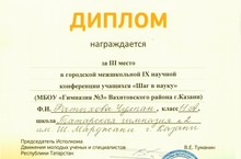 Ученица 11А класса Чулпан Фатыхова участвовала в городской межшкольной IX научной конференции учащихся "Шаг в науку: школа - образовательное пространство формирования культуры Мира учащихся" и заняла 3 место. Поздравляем и желаем успехов!
