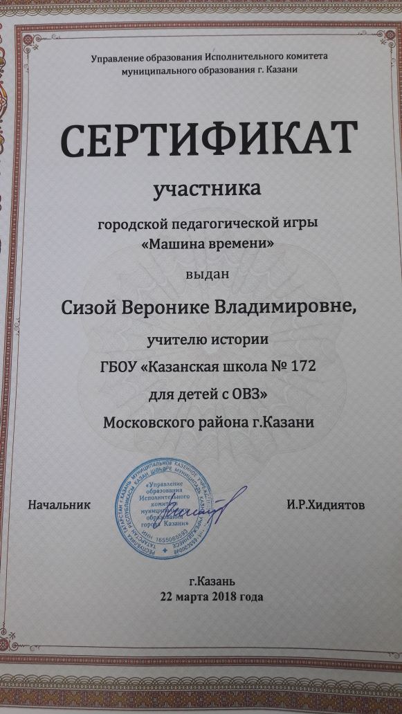 Сертификат Сизой В.В. за участие в городской педагогической игре "Машина времени"