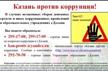 В случаях незаконных сборов денежных средств и иных коррупционных проявлений в образовательных учреждениях г.КазаниВы можете обратиться:• 299-17-08, 299-17-09 - горячая линия по вопросам коррупции в г.Казани• kzn-protiv@yandex.ru - официальный портал «Казань против коррупции. Сообщи о взяточнике» (http://www.kzn.ru/old/anticorruption)• 292-70-50 - горячая линия Управления образования г.КазаниКоррупция - злоупотребление служебным положением, дача взятки, получение взятки, злоупотребление полномочиями, коммерческий подкуп либо иное незаконное использование физическим лицом своего должностного положения вопреки законным интересам общества и государства в целях получения выгоды в виде денег, ценностей, иного имущества или услуг имущественного характера, иных имущественных прав для себя или для третьих лиц либо незаконное предоставление такой выгоды указанному лицу другими физическими лицами (Федеральный закон от 25.12.2008 №273"О противодействии коррупции" ст.1) -