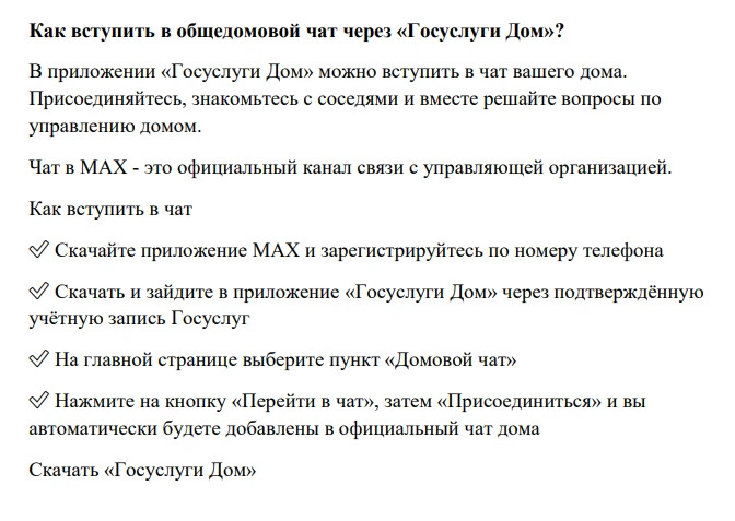 Госжилинспекция РТ создала 5418 официальных домомвых чатов для домов с 16 и более квартирами. В меньших домах жители и УК могут создать чат самостоятельно. Платформа интегрирована с ГИС ЖКХ и реестрами управляющих организаций. Через MAX можно сообщить о неисправностях, узнавать об отключениях и ремонтах, уточнять начисления и передавать показания счетчиков без визита в офис.