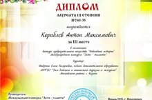 Поздравляем Кораблева Антона, занявшего III место в международном конкурсе "Дети-таланты" в номинации конкурса изобразительного искусства "Новогодние истории", под руководством педагога дополнительного образования Шадриной О.В.