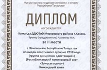 20 и 21 октября 2018 года команда ДДЮТиЭ Московского района г.Казани приняла участие в Чемпионате Республики Татарстан по видам спортивного туризма 2018 года (группа дисциплин "дистанция") (Республиканский комплексный слет "Золотая осень"), который состоялся в г.Зеленодольск (СК "Маяк"). Учащиеся ДДЮТиЭ достойно выступили на дистанции, завоевали призовые места. Поздравляем и желаем дальнейших побед!