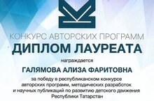 Поздравляем Галямову Ализу Фаритовну! По итогам республиканского конкурса авторских программ, методических разработок и научных публикаций по развитию детского движения Республики Татарстан Ализа Фаритовна награждена дипломом лауреата! Желаем новых побед и высоких достижений!
