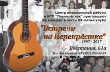26 ноября состоялся концерт для любителей авторской песни "Встречи на Перекрестке", который был организован педагогами ЦВР Гребневой Аллой Юрьевной и Мухутдиновой Анной Сергеевной в честь 20-летия клуба "Перекресток". В концерте приняли участие учащиеся объединения "Игра на гитаре", а также гости вечера ансамбль "Версаль", В. Гольцман, Э. Галеева, С. Бальцер, В. Боков и другие известные Казанские барды.