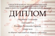 3 февраля 2016 года в ДМШ № 26 Вахитовского района состоялось городское методическое объединение педагогов-пианистов ДМШ и ДШИ системы образования г.Казани, где подводились итоги Городского конкурса педагогических идей преподавателей фортепианных отделов ДМШ и ДШИ системы образования г.Казани. Поздравляем Гараеву И. Р., получившую Диплом Лауреата I степени за сборник переложений "Играем в ансамбле", Диплом лауреата I степени за портфолио педагогических достижений. Желаем дальнейших творческих успехов!