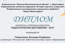 Поздравляем Гайнуллину Эльвиру Рауфовну со званием Лауреата 2 степени конкурса "Педагогические достижения-2015" в номинации "Личный сайт работника системы науки и образования"