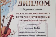 Поздравляем Аристову Софью — Лауреата II степени Республиканского конкурса по теории и истории музыки «Музыкальный эрудит»!Софья достойно представила нашу школу, показав высокий уровень знаний и любовь к музыкальному искусству.Особую благодарность выражаем преподавателю — Арслановой Дании Наилевне за профессионализм и подготовку лауреата.Гордимся и желаем новых успехов! -
