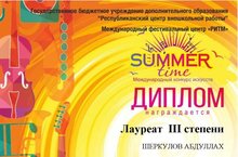 В конце июня наши ученики приняли участие в самом прекрасном летнем конкурсе «Summer time». Это международный конкурс искусств, в котором заняли следующие места:Шеркулов Абдуллах (преподаватель Биктимерова Алсу Исмаиловна) – Лауреат 3 степени;Петухова Евангелина (преподаватель Музурова Елена Николаевна) – Дипломант 1 степени.В конкурсе вручили Благодарность Алсу Исмаиловне и Елене Николаевне за высокие достижения в педагогической деятельности и квалифицированную работу по подготовке участников конкурса. -