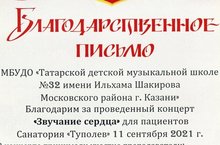 11 сентября 2021 года состоялся концерт "Звучание сердца" для пациентов санатория "Туполева". На концерте принимали участие преподаватели Сорокина Е.В.,Марданова Г.Ф., Биктимерова А.И. а так же учащиеся Паргеева Кира, Галкина Ангелина, Мухаметзянов Вильдан. Всем участникам концерта пожелали творческих успехови и вручили Благодарственное письмо.