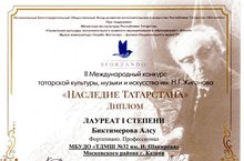 Преподаватель нашей школы Биктимерова Алсу Исмаиловна приняла участие во II Международном конкурсе татарской культуры, музыки и искусства им.Н.Г.Жиганова «Наследие Татарстана» и стала Лауреатом 1 степени в номинации «Фортепиано. Профессионал».
