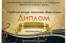 Аглиуллина Карина, преп. Гараева Ильмира Расиховна, стала Лауреатом в двух номинациях: Лауреатом 2 степени в номинации «Лучшее исполнение Этюда или виртуозной пьесы» и Лауреатом 3 степени в номинации «Лучшее исполнение кантиленной пьесы».