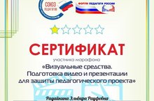 Преподаватель Радайкина Эльвира Рауфовна приняла участие в марафоне «Визуальные средства. Подготовка видео и презентации для защиты педагогического проекта» Всероссийского форума «Педагоги России: инновации в образовании», который прошел 19 апреля 2021 года.