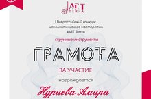 19-21 апреля 2021 года в г.Уфа состоялся I Всероссийский конкурс исполнительского мастерства «ART Terra», в котором приняла участие и награждена Грамотой ученица нашей школы Нуриева Амира.