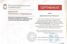 Преподаватель Артамонова Ксения Михайловна выступила с презентацией педагогического опыта по теме: «Музыкальная терапия в работе с детьми в условиях дополнительного образования» перед слушателями курсов повышения квалификации «Формирование профессиональной компетентности учителя предметной области «Искусство» в образовательной среде», 14 апреля 2021 года в Казанском федеральном университете, получила Сертификат.