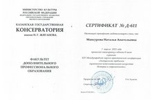 Преподаватель Мансурова Наталья Анатольевна прошла стажировку в рамках XIV Международной научно-практической конференции «Актуальные проблемы музыкально-исполнительского искусства: История и современность», 7 апреля 2021 года в Казанской государственной консерватории имени Н.Г.Жиганова.