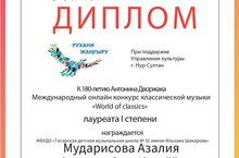 Поздравляем Мударисову Азалию с победой в Международном онлайн конкурсе классической музыки «World of classics», посвященному 180-летию Антонина Дворжака! Конкурс учрежден Международным фестивальным движением «Astana Stars» при поддержке Управления культуры г.Нур-Султан.