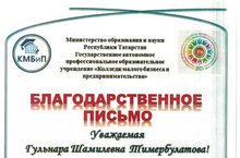 Преподаватель Тимербулатова Гульнара Шамилевна приняла участие в Творческой встрече, посвященной Году родных языков и народного единства в Республике Татарстан, который состоялся в Колледже малого бизнеса и предпринимательства, за что награждена Благодарственным письмом.