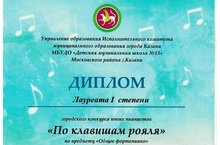 В марте 2021 года в Казани прошел Городской конкурс юных пианистов «По клавишам рояля», в котором ученица нашей школы Фатыхова Малика, преп. Ирбулатова Лилия Камилевна, стала Лауреатом 1 степени в номинации «Общее фортепиано».