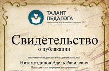 Преподаватель Низамутдинов Адель Равилевич опубликовал на сайте Международного центра проведения и разработки интерактивно-образовательных мероприятий «Талант педагога» методическую разработку «Инновационные технологии в обучении балалаечников и домристов: об игре под фонограмму», и получил Свидетельство о публикации.