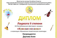 В марте 2021 года в Чистополе прошел XIV Республиканский фестиваль-конкурс «Камская мозаика», в котором учащаяся нашей школы Даутова Алия, преп. Кавайкина Р.А., в номинации «Музыкально-теоретическая олимпиада» стала Лауреатом 2 степени.