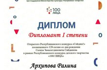 28 февраля 2021 года прошел Открытый Республиканский конкурс «Сәйдәш», посвященного 120-летию со дня рождения Салиха Замалетдиновича Сайдашева в рамках Республиканского конкурса детского творчества «100//ЛИЦА», в котором ученица ТДМШ №32 Архипова Ралина, преп. Файзуллина А.Т., стала Дипломантом 1 степени.